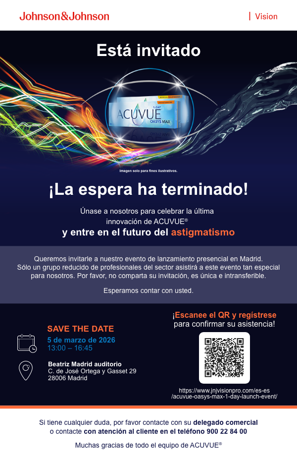 Protección de datos personales: Usted ha recibido este mensaje porque mantiene una relación comercial con Johnson & Johnson, S.A.. Utilizamos su información para la gestión integral de nuestra relación comercial si usted es un profesional de la salud. Con su consentimiento, en su caso, Johnson & Johnson Vision Care como responsable de tratamiento de sus datos personales utilizará su información personal para enviarle información sobre nuestros productos y servicios de la manera que mejor se ajuste a sus intereses, por medios electrónicos. Puede retirar su consentimiento en cualquier momento. Por favor, lea nuestra Política de Privacidad a la que puede acceder en el link situado en la parte superior. Debido a la globalización de nuestra actividad su información personal podrá transferirse a otras compañías del Grupo Johnson & Johnson, así como a los proveedores de servicios que utilicemos, para la realización de los fines descritos anteriormente – e.g. proveedores de servicios tecnológicos-, incluso en terceros países, como Estados Unidos, que pueden tener una legislación propia para el tratamiento de datos de carácter personal. Los datos se transferirán en su caso con las garantías adecuadas (ej. a compañías que hayan suscrito las Cláusulas Contractuales Tipo de la Comisión Europea; más información en emeaprivacy@its.jnj.com). El listado de las entidades de la familia Johnson & Johnson está disponible en: https://www.investor.jnj.com/sec.cfm Para revisar, corregir, actualizar, restringir, eliminar o solicitar una copia electrónica de su información personal diríjase a protecciondedatosvision@its.jnj.com Más información general sobre privacidad en www.jnjvisionpro.com/es-es/privacy-policy/. ACUVUE® es una marca registrada de Johnson & Johnson © JJV ES 2026 | 26VIS044-ES | 2026PP04517