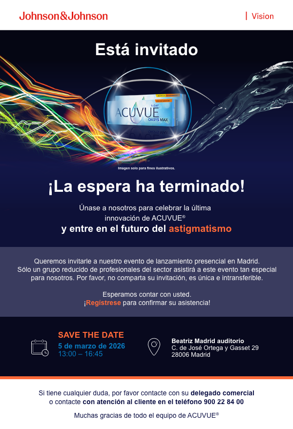 Protección de datos personales: Usted ha recibido este mensaje porque mantiene una relación comercial con Johnson & Johnson, S.A.. Utilizamos su información para la gestión integral de nuestra relación comercial si usted es un profesional de la salud. Con su consentimiento, en su caso, Johnson & Johnson Vision Care como responsable de tratamiento de sus datos personales utilizará su información personal para enviarle información sobre nuestros productos y servicios de la manera que mejor se ajuste a sus intereses, por medios electrónicos. Puede retirar su consentimiento en cualquier momento. Por favor, lea nuestra Política de Privacidad a la que puede acceder en el link situado en la parte superior. Debido a la globalización de nuestra actividad su información personal podrá transferirse a otras compañías del Grupo Johnson & Johnson, así como a los proveedores de servicios que utilicemos, para la realización de los fines descritos anteriormente – e.g. proveedores de servicios tecnológicos-, incluso en terceros países, como Estados Unidos, que pueden tener una legislación propia para el tratamiento de datos de carácter personal. Los datos se transferirán en su caso con las garantías adecuadas (ej. a compañías que hayan suscrito las Cláusulas Contractuales Tipo de la Comisión Europea; más información en emeaprivacy@its.jnj.com). El listado de las entidades de la familia Johnson & Johnson está disponible en: https://www.investor.jnj.com/sec.cfm Para revisar, corregir, actualizar, restringir, eliminar o solicitar una copia electrónica de su información personal diríjase a protecciondedatosvision@its.jnj.com Más información general sobre privacidad en www.jnjvisionpro.com/es-es/privacy-policy/. ACUVUE® es una marca registrada de Johnson & Johnson © JJV ES 2026 | 26VIS044-ES | 2026PP04517